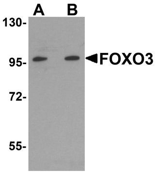 Western blot analysis of FOXO3 in A-20 cell lysate with FOXO3 antibody at (A) 0.5 and (B) 1 ug/ml.