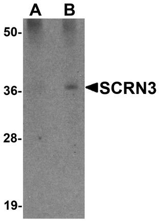 Western blot analysis of SCRN3 in 293 cell tissue lysate with SCRN3 antibody at (A) 1 and (B) 2... |