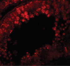 Immunofluorescence of CRISP in human testis tissue with CRISP antibody at 20 ug/ml. |