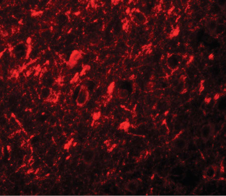 Immunofluorescence of NALP10 in human brain tissue with NALP10 antibody at 20 ug/ml.