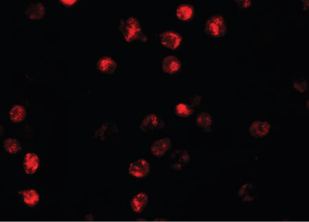 Immunofluorescence of NALP13 in K562 cells with NALP13 antibody at 20 ug/ml.