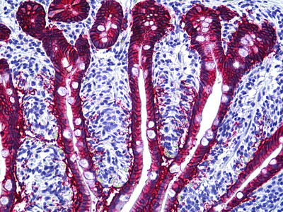 Ep-Cam (also called ESA, EGP40, 17-1A antigen, KSA, GA7333-2) is a 40kD epithelial protein expressed on baso-lateral cell surfaces in very many epithelial tissues (but absent from mesothelial tissues). The extracellular domain has a cysteine-rich rep ...