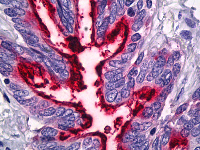Anti-MUC1 antibody IHC of human lung, respiratory epithelium. |
