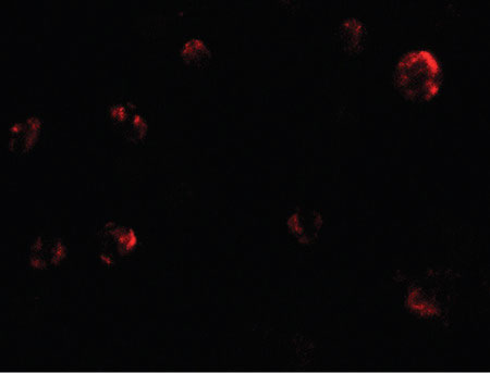 Immunofluorescence of EIG121 in MCF7 cells with EIG121 antibody at 20 ug/ml.