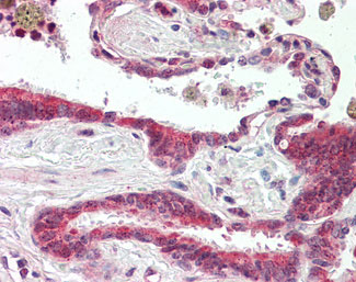 Anti-CRYPTIC antibody IHC staining of human lung, respiratory epithelium. |