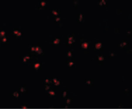 Immunofluorescence of IFITM1 in Jurkat cells with IFITM1 antibody at 20 ug/ml.