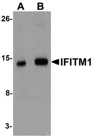 Western blot analysis of IFITM1 in 3T3 cell lysate with IFITM1 antibody at (A) 1 and (B) 2 ug/ml. |