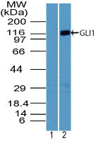Western blot of GLI1 in human kidney lysate using 1) pre-immune sera at 1:5000 dilution and 2)... |