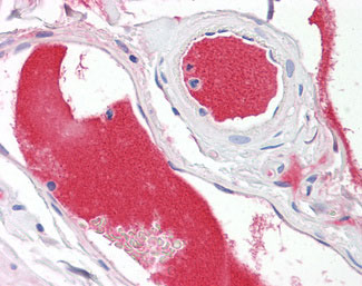 Anti-A1BG / GAB antibody IHC of human colon, submucosal vessels. |