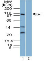 Western blot of RIG-I Antibody in 293 lysate in the 1) absence and 2) presence of immunizing...