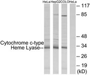 Western blot of extracts from HeLa/HepG2/COLO cells, using Cytochrome c-type Heme Lyase Antibody. |