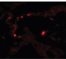 Immunofluorescence of MMP9 in human lung tissue with MMP9 antibody at 20 ug/ml. |