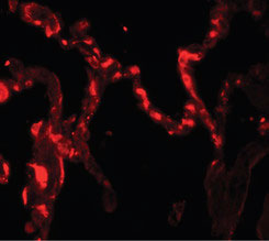 Immunofluorescence of IL-12A in human kidney tissue with IL-12A antibody at 20 ug/ml. |
