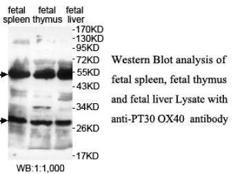 Western Blot analysis of fetal spleen,fetal thymus and fetal liver Lysate with anti-PT30 OX40 antibody |