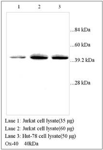 Lane1: Jurkat cell lysate(35 μg): Lane2: Jurkat cell lysate(60 μg); Lane3:Hut-78 cell lysate(50 μg); Ox-40:40kDa |