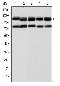 Western blot using BMPR2 mouse monoclonal antibody against HeLa (1), A431 (2), NIH/3T3 (3), Cos7...