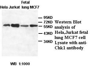western blot analysis of hela,jurkat fetal lung mcf7 cell lysate with anti-chkl antibody |