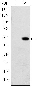 Figure 1: Western blot analysis using RBP4 mAb against HEK293 (1) and RBP4(AA: 1-201)-hIgGFc transfected HEK293 (2) cell lysate.