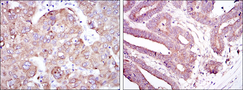 Figure 2: Immunohistochemical analysis of paraffin-embedded liver cancer tissues (left) and stomach cancer tissues (right) using RBP4 mouse mAb with DAB staining. |