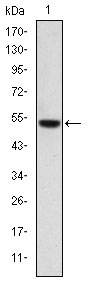 Figure 1: Western blot analysis using PODXL mAb against human PODXL (AA: 109-324) recombinant protein. (Expected MW is 47.3 kDa) |