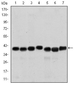 Figure 1: Western blot analysis using SMN1 mouse mAb against HepG2 (1), Hela (2), K562 (3), Jurkat (4), SKBR-3 (5), A431 (6) and Cos7 (7) cell lysate.