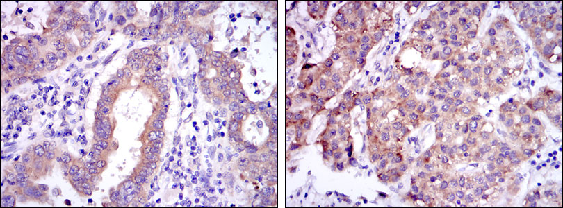 Figure 2: Immunohistochemical analysis of paraffin-embedded endometrial cancer tissues (left) and liver cancer tissues (right) using c-Rel mouse mAb with DAB staining. |