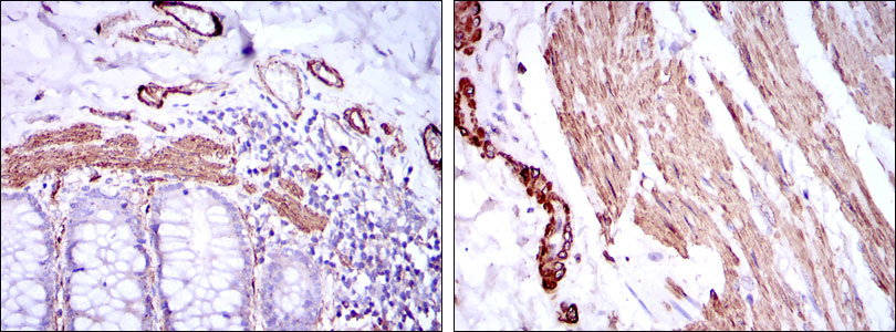 Figure 2: Immunohistochemical analysis of paraffin-embedded human duodenum tissues (left) and human esophagus tissues (right) using ACTA2 mouse mAb with DAB staining. |