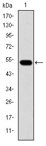 Figure 1: Western blot analysis using GCK mAb against human GCK (AA: 1-198) recombinant protein. (Expected MW is 48.2 kDa)