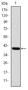 Figure 1: Western blot analysis using ITK mAb against human ITK (AA: 2-120) recombinant protein. (Expected MW is 39.7 kDa)