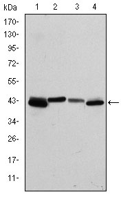 Figure 2: Western blot analysis using KRT19 mouse mAb against T47D (1), MCF-7 (2), HepG2 (3) and SW620 (4) cell lysate. |