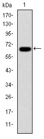 Figure 1: Western blot analysis using PSMB8 mAb against human PSMB8 (AA: 1-272) recombinant protein. (Expected MW is 55.2 kDa)