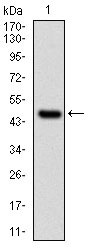 Figure 1: Western blot analysis using UBE2I mAb against human UBE2I (AA: 1-158) recombinant protein. (Expected MW is 45.3 kDa)