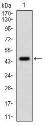 Figure 1: Western blot analysis using PPP1CA mAb against human PPP1CA (AA: 174-330) recombinant protein. (Expected MW is 43.4 kDa)