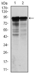 Figure 2: Western blot analysis using NEFL mouse mAb against Hela (1) and Jurkat (2) cell lysate. |