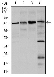 Figure 3: Western blot analysis using FOXO1 mouse mAb against Hela (1), HEK293 (2), MCF-7(3), and C6 (4) cell lysate. |