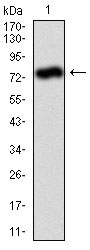 Figure 1: Western blot analysis using ALPL mAb against human ALPL (AA: 18-502) recombinant protein. (Expected MW is 78.9 kDa)