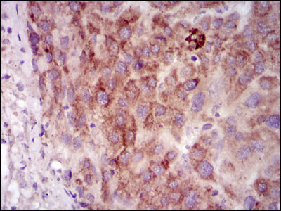 Figure 2: Immunohistochemical analysis of paraffin-embedded liver cancer tissues using PRKACG mouse mAb with DAB staining. |