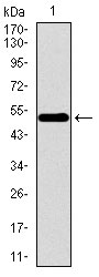 Figure 1: Western blot analysis using WDR66 mAb against human WDR66 recombinant protein. (Expected MW is 53.9 kDa)
