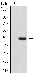 Figure 2: Western blot analysis using IL2RA mAb against HEK293 (1) and IL2RA (AA: 34-139)-hIgGFc transfected HEK293 (2) cell lysate. |