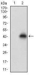 Figure 2: Western blot analysis using NPC1 mAb against HEK293 (1) and NPC1 (AA: 34-174)-hIgGFc transfected HEK293 (2) cell lysate. |