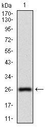 Figure 1: Western blot analysis using NT5E mAb against human NT5E (AA: 30-250) recombinant protein. (Expected MW is 26.6 kDa)