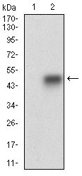 Figure 2: Western blot analysis using SMCP mAb against HEK293 (1) and SMCP (AA: FULL(1-116))-hIgGFc transfected HEK293 (2) cell lysate. |
