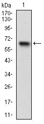 Figure 1: Western blot analysis using RPS6KA2 mAb against human RPS6KA2 (AA: 415-734) recombinant protein. (Expected MW is 62 kDa)