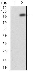Figure 2: Western blot analysis using JAK2 mAb against HEK293 (1) and JAK2(AA: 545-1124)-hIgGFc transfected HEK293 (2) cell lysate. |