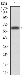 Figure 2:Western blot analysis using VAV2 mAb against human VAV2 (AA: 552-868) recombinant protein. (Expected MW is *** kDa)