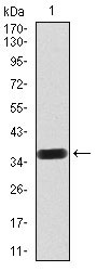 Figure 2:Western blot analysis using PDGFRB mAb against human PDGFRB (AA: 33-133) recombinant protein. (Expected MW is 37 kDa)