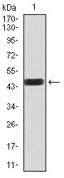 Figure 2:Western blot analysis using SALL4 mAb against human SALL4 (AA: 954-1053) recombinant protein. (Expected MW is 46.3 kDa)