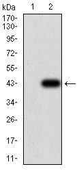 Figure 3:Western blot analysis using RAD21 mAb against HEK293 (1) and RAD21 (AA: 287-403)-hIgGFc transfected HEK293 (2) cell lysate. |