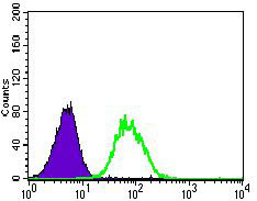 Figure 2: Flow cytometric analysis of HeLa cells using NES mouse mAb (green) and negative control (purple). |