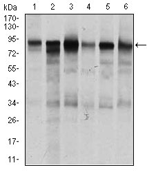 Figure 2: Western blot analysis using TGFBR3 mouse mAb against Jurkat (1), HeLa (2), MCF-7 (3), F9 (4), SK-N-SH (5), and NIH3T3 (6) cell lysate. |